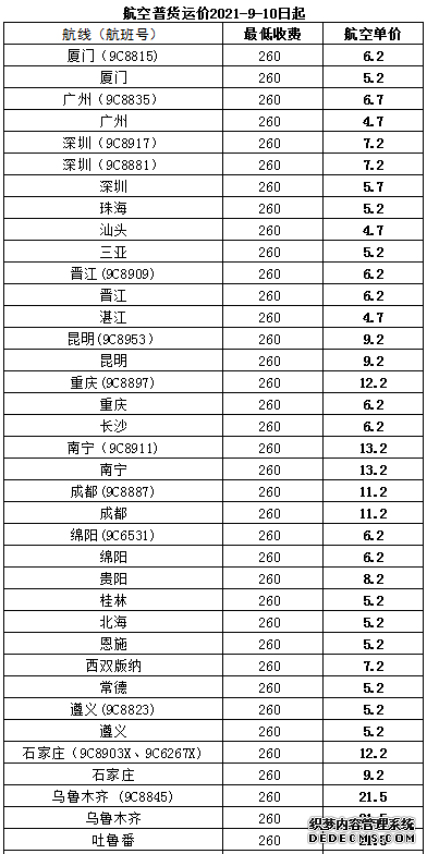 上海虹桥机场货运公司空运价格分为多家航空公司的运价,目前上海有上海航空运价,春秋航空运价,海南航空运价,东方航空运价,吉祥航空运价,和厦门航空运价等。具体参照我们的上海机场货运实时运价,由于时间到了2021年9月份,各行各业都开始发力,每天的货物很多通过物流发货出去,其中就不乏很多货物都是通过机场货运公司运输的,虹桥机场货运公司,是一家二十四小时营业的物流公司,主要经营航空物流,航空物流都是通过飞机方式运输的,其优势就是速度快,全国地区即日达,客户文件和工业用品都可以通过机场货运运输,虹桥机场货运部的空运价格是260元起步,100公斤有特价,在5.5元每公斤,新疆地区的运价在15元每公斤。